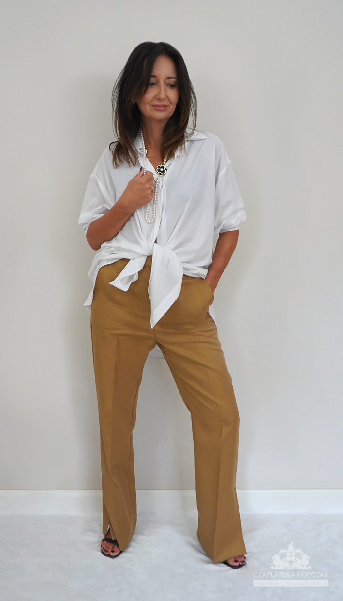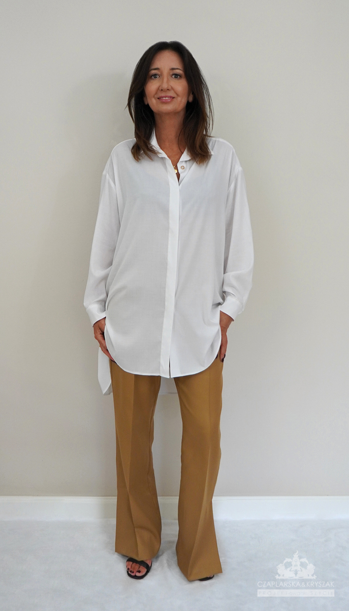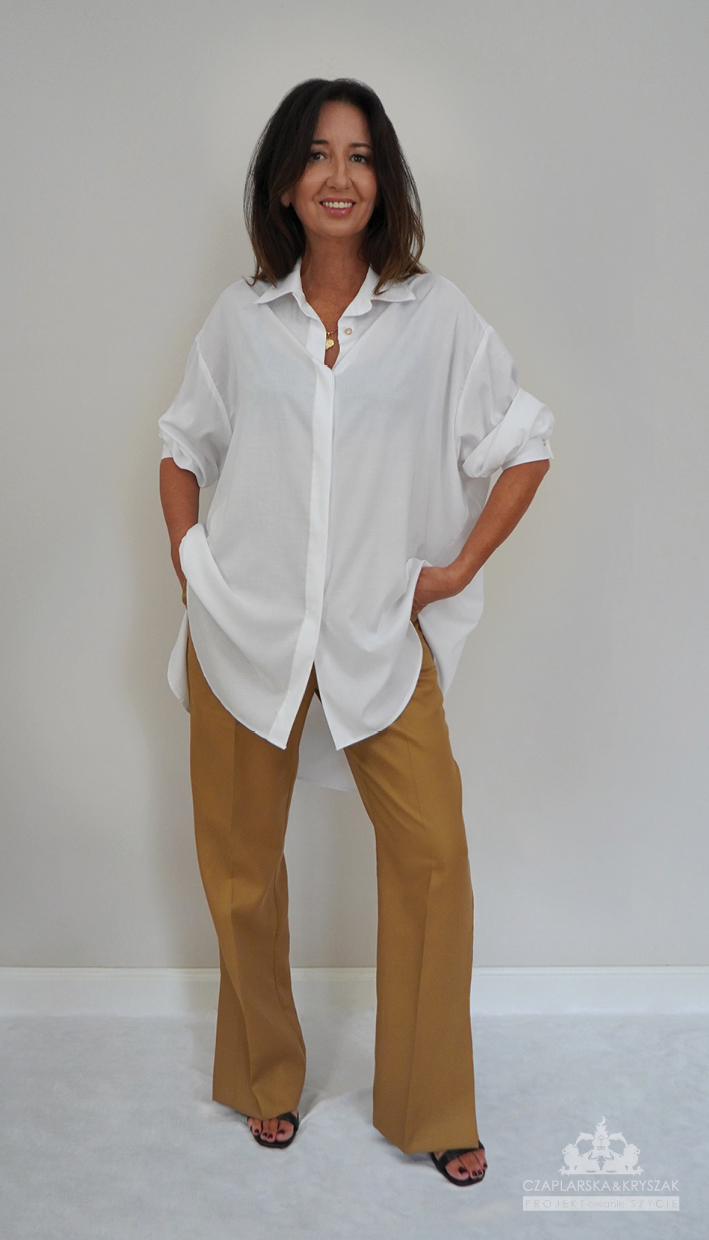 Koszula damska to element damkiej garderoby, który jest klasycznym i eleganckim wyborem na rożne okazje. Kołnierzyk, mankiety oraz listwa przy guzikach wykończone są złotą nitką.Guziki perłowe.Tkanina delikatna wiskoza.
